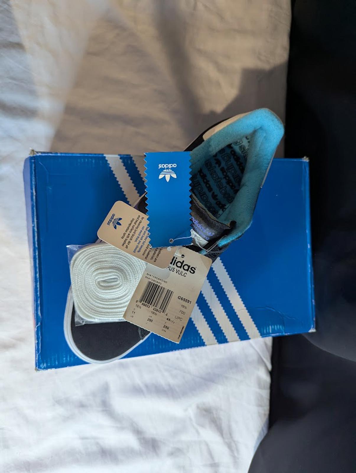 Selling a deadstock (DS) pair of VINTAGE ADIDAS Campus Vulc shoes in a Men's US size 11 (Style Code: G65591). This colorway—Black with Purple and Light Aqua (Teal) accents—is a rare gem from the early 2010s, perfect for collectors and fans of the classic Campus silhouette.
