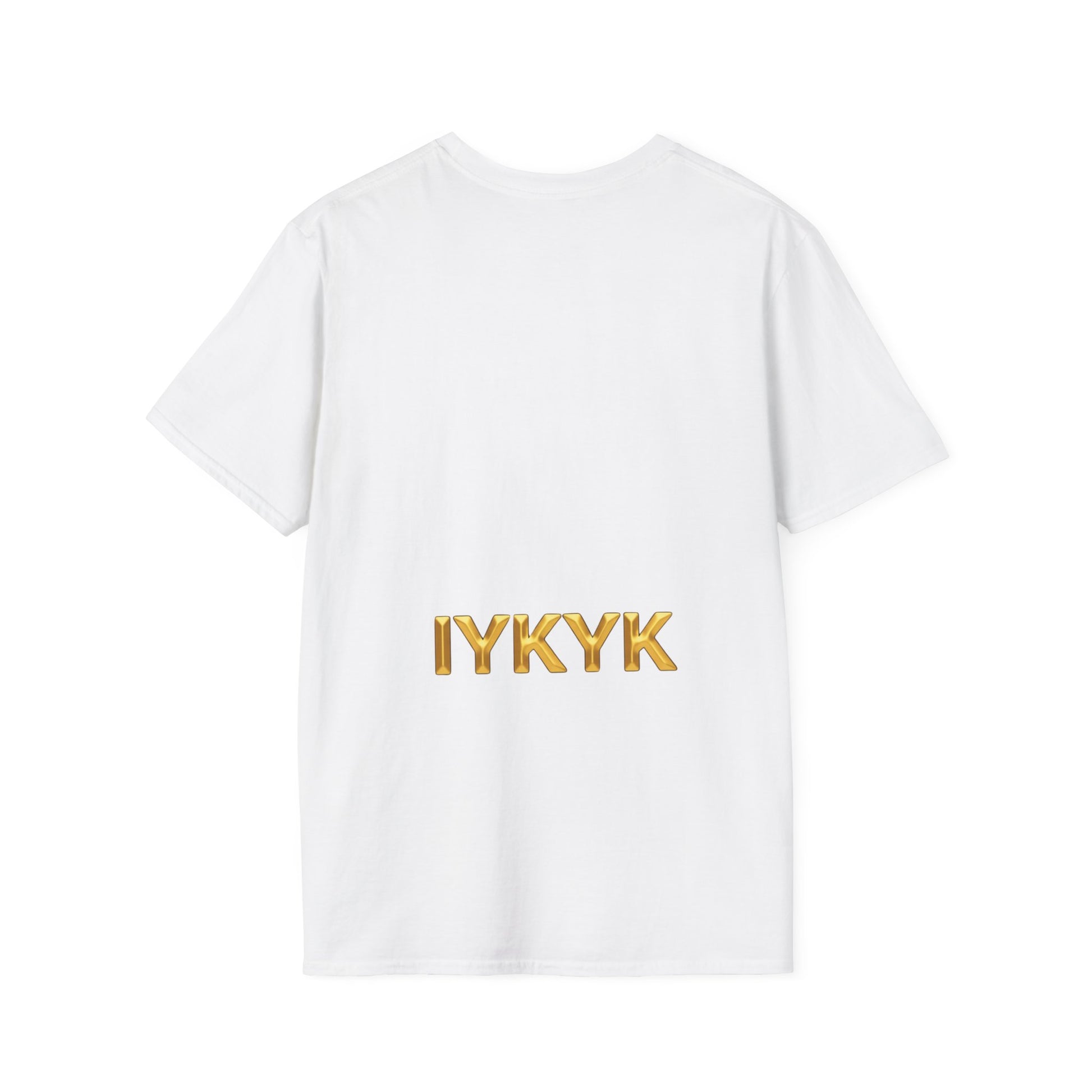 A clean, soft tee made to carry a subtle laugh and a knowing glance. The front shows two golden hands poised in a playful gesture against a rich, patterned backdrop — a quiet nod to shared jokes and insider moments. The back keeps that wink alive with compact gold lettering reading “IYKYK,” so the people who get it will feel seen. Lightweight and smooth, this shirt slips into everyday life: layered under a jacket for a city evening, thrown on for coffee runs, or worn while hanging out with friends who speak the same language of small, private jokes. The mood is private and warm — like the tiny, perfect moment when you and your people all lean in together.