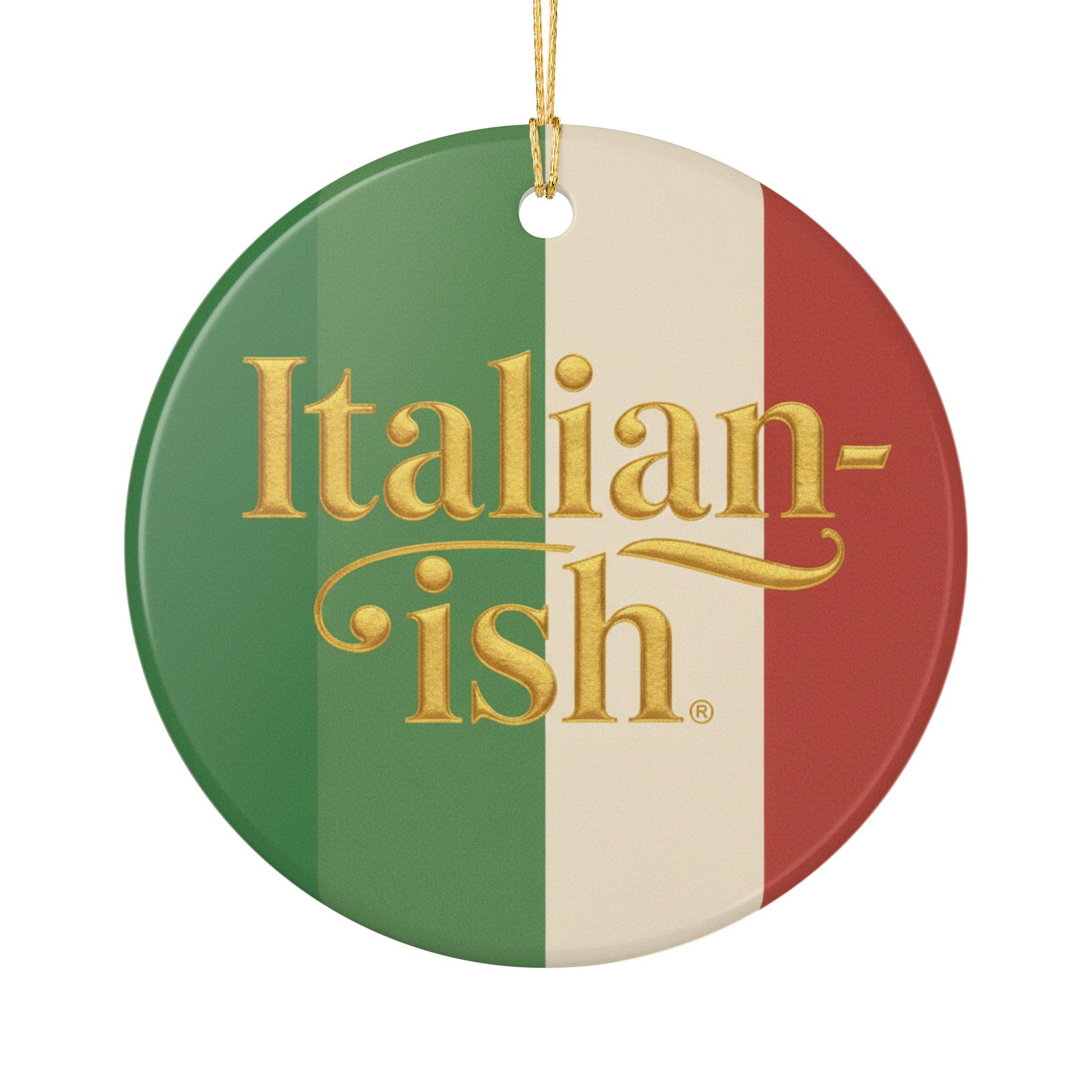 This glossy ceramic ornament captures a warm nod to Italian heritage with a vintage-inspired gold-lettered "Italian-ish" script over the green-white-red tricolor. Lightweight but sturdy, it hangs from a gold string that catches the light and adds an elegant touch to holiday trees, kitchen windows, or wall hooks. The matte-finish print sits crisp against the shiny ceramic surface, creating a refined contrast that feels both celebratory and casually personal. It slips easily into themed décor for family gatherings, holiday dinners, or as a little token for someone who loves Italian flavors and culture.