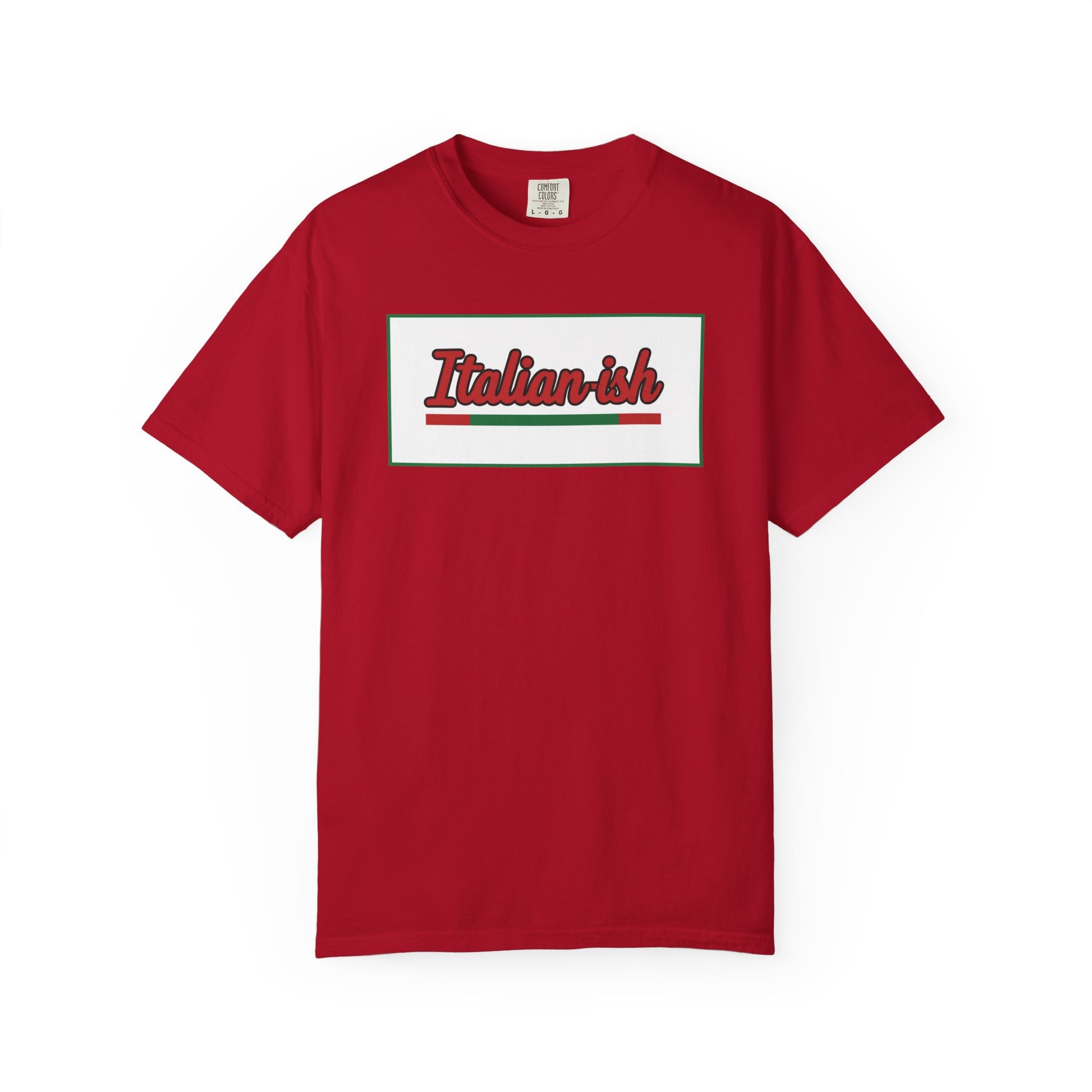 Lightweight, lived-in comfort wrapped in a wink of heritage. This garment-dyed tee feels broken-in from the first wear — soft ring-spun cotton with a relaxed fit that settles naturally across the shoulders. The bold “Italian-ish” script across the chest pairs vintage lettering with a subtle green-and-red underline, an easy nod to family recipes, late-night pasta, and the half-serious pride of anyone who grew up around sauce-stained aprons or Sunday gatherings. It’s the kind of tee you reach for when you want to show belonging without saying too much: pair it with worn jeans, an apron, or your favorite travel jacket and head out to a casual dinner, a family meetup, or a weekend market. Thoughtful details like tubular knit construction, double-needle seams, and a sewn-in label mean this shirt will keep its shape and color through repeated wear and washes.