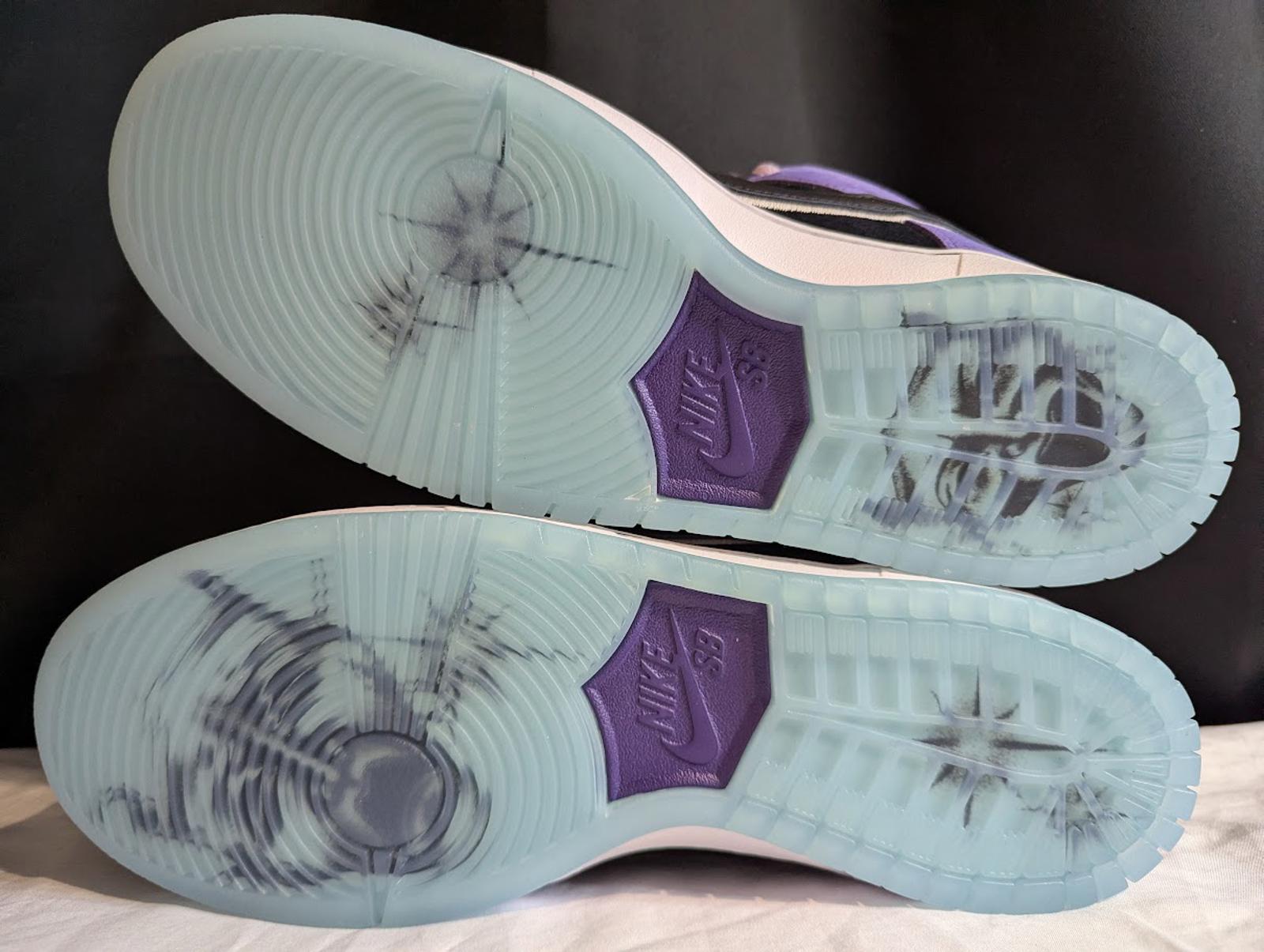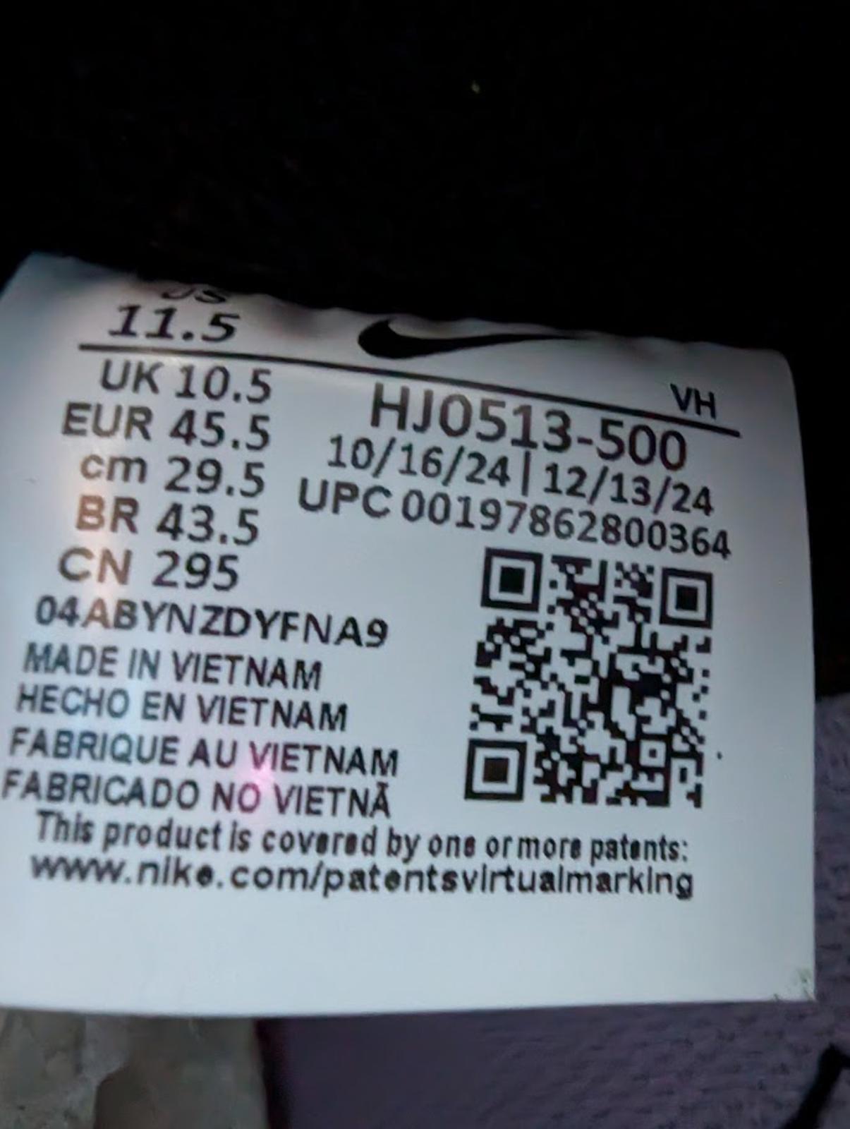 The shoe features a mix of bold purple suede overlays and black suede across the midfoot, with white leather for contrast. Key details include UV-light-reactive thread around the Swooshes and heel tabs, a semi-translucent outsole, and barbed-wire embroidery. Lift the tongue to find Hayley’s signature "You Reckon" catchphrase. These come complete with all original lace options.