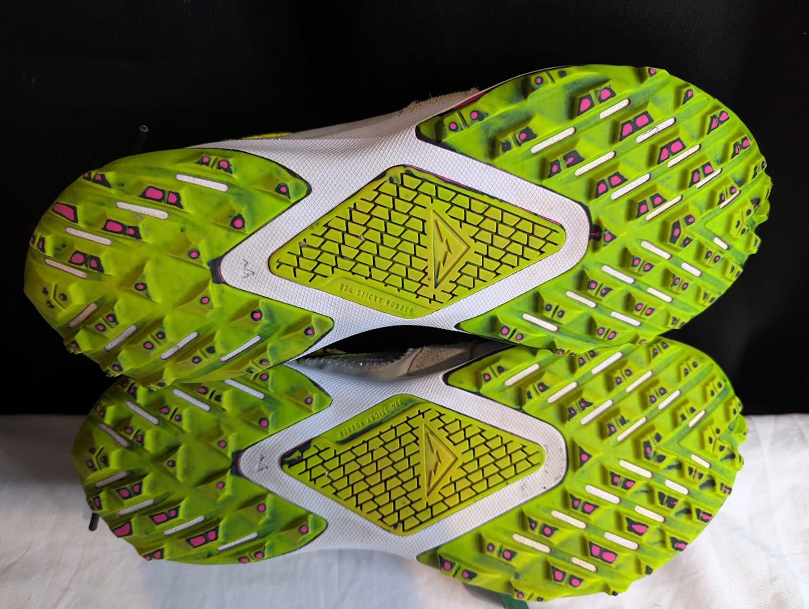 These sneakers are in excellent used condition. The unique feature of this pair is the outsole spikes are worn down/removed (no nubs), which improves comfort and practicality for everyday walking. The signature features like the exaggerated tongue, "SHOELACES" print, oversized swoosh, and zip-tie loop remain intact. The White and Orange colorway is clean and vibrant.