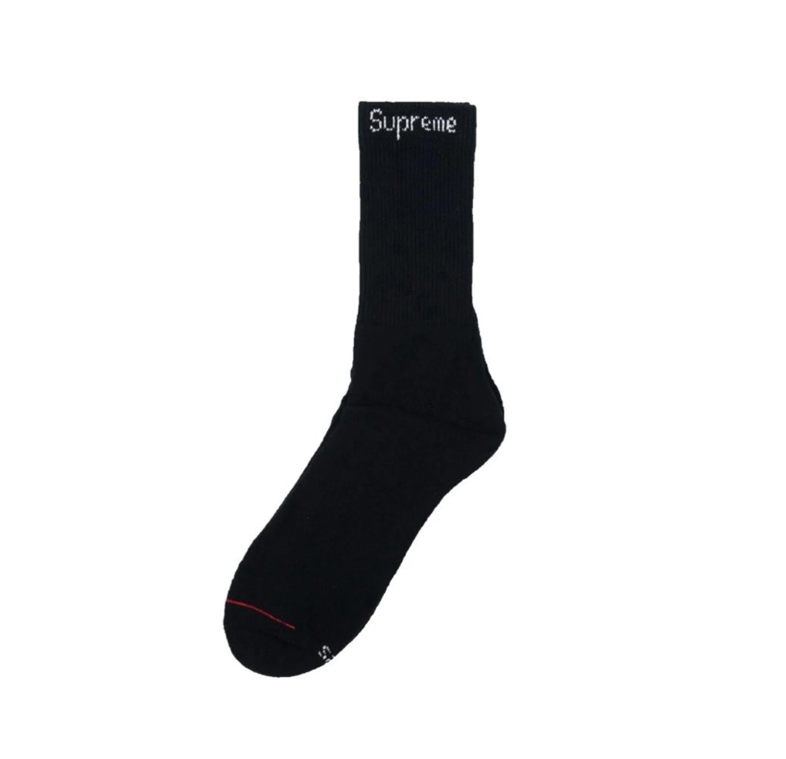 These are a black cotton-blend crew sock featuring a cushioned footbed for all-day comfort. The signature detail is the jacquard-knit Supreme Box Logo displayed prominently on the ribbed cuff. They are designed as a Size 6-12 (One Size Fits Most), making them a versatile addition to any wardrobe.
