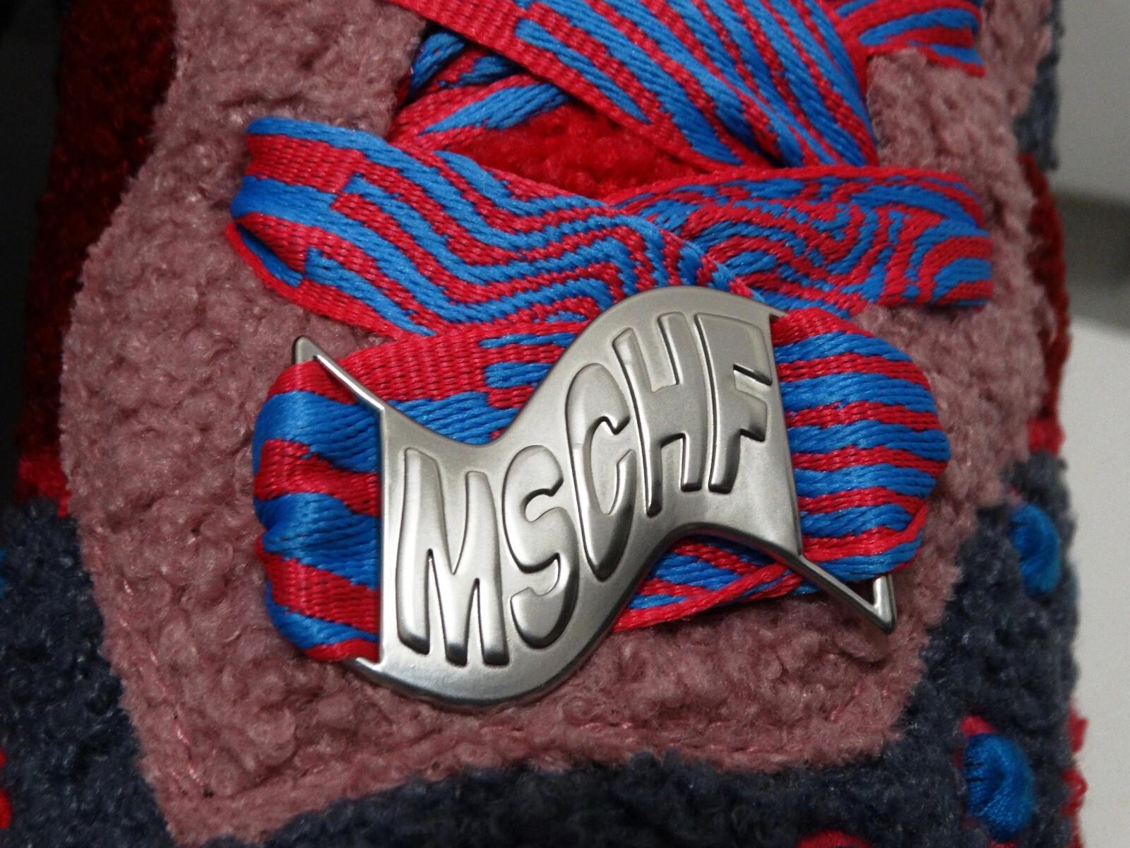 The design is a complete departure from the standard leather sneaker. It features a wild, thick fleece upper in a kaleidoscope of red, pink, blue, and purple, giving it a texture reminiscent of a retro shag rug or 3D glasses. The laces are finished in a unique seersucker pattern, and the shoe is detailed with blue beads near the toe box. The look is grounded by a grey midsole and a vibrant blue rubber outsole, with MSCHF branding prominent on the tongue and heel.